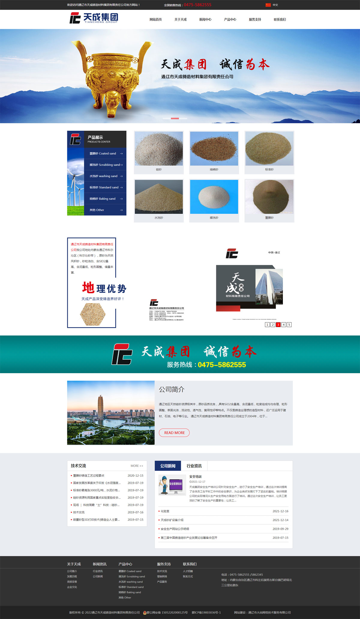 通遼市天成鑄造材料集團有限責任公司成立于2004年,位于科爾沁大草原的科爾沁砂帶,東北交通樞紐,這里交通便利、環(huán)境優(yōu)美、景色宜人。礦區(qū)位于通遼市科爾沁左翼后旗努古斯臺鎮(zhèn),礦區(qū)占地面積為0.0246平方公里臨近北京市、河北省、遼寧省距離錦州港300公里左右。公司現(xiàn)有員工100人左右,工程技術人員30余人。年產覆膜砂5萬多噸:年產擦洗砂、水洗砂等其它品種30余萬噸。